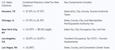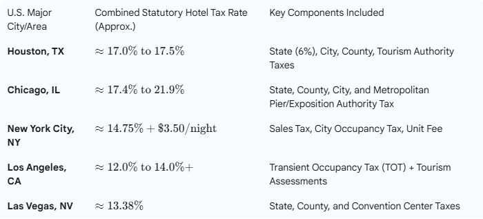 📌 Example: A $200 hotel room in New York City can have over $35 in combined taxes and fees per night once state sales tax, occupancy tax, and local surcharges are included.